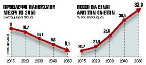- Ο δείκτης εξάρτησης ηλικιωμένων άνω των 65 ετών προς τον οικονομικά ενεργό πληθυσμό, που οδεύει προς το 60%, από 39% που είναι σήμερα.