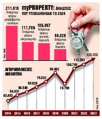 Σύμφωνα με τα στοιχεία της ΑΑΔΕ, το 2024 μέσω της πλατφόρμας myPROPERTY υποβλήθηκαν 211.610 δηλώσεις φόρου μεταβίβασης ακινήτων αλλά και 111.705 δηλώσεις φόρου κληρονομιάς.