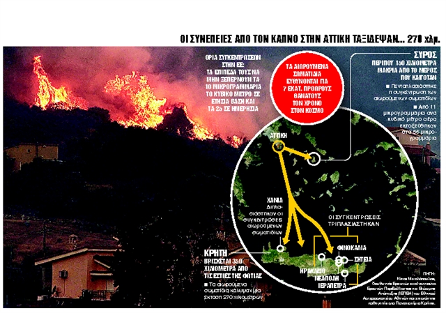Πνίγηκαν στα αιωρούμενα σωματίδια η Σύρος και η Κρήτη εξαιτίας της πυρκαγιάς στην Ανατολική Αττική (!). Οπως επισημαίνει μιλώντας στα «ΝΕΑ» ο διευθυντής Ερευνών στο Ινστιτούτο Ερευνών Περιβάλλοντος και Βιώσιμης Ανάπτυξης (ΙΕΠΒΑ) του Εθνικού Αστεροσκοπείου Αθηνών και επισκέπτης καθηγητής στο Πανεπιστήμιο Κρήτης, Νίκος Μιχαλόπουλος, ο καπνός «άπλωσε» και ταξίδεψε στο Αιγαίο έως τη Σύρο και την Κρήτη.