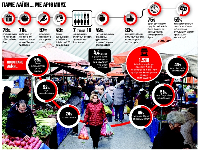 Σύμφωνα με στοιχεία έρευνας του Ινστιτούτου Ερευνας Λιανεμπορίου Καταναλωτικών Αγαθών (ΙΕΛΚΑ), οι Ελληνες επισκέπτονται τις λαϊκές αγορές κατά μέσο όρο 4,4 φορές τον μήνα, ενώ ένα στα δύο φρούτα και λαχανικά που καταναλώνονται από τα νοικοκυριά αγοράζεται από τους πάγκους των παραγωγών και των πωλητών στις λαϊκές. Τα αποτελέσματα έρευνας γνώμης που διεξήγαγε φέτος για λογαριασμό του Φορέα Λειτουργίας Λαϊκών Αγορών της Περιφέρειας Αττικής, με αντικείμενο τις αντιλήψεις και τις προκλήσεις για τις λαϊκές αγορές της Αττικής σήμερα, η Metron Analysis και παρουσιάστηκαν στο πρώτο συνέδριο του Φορέα με θέμα «Το Παρόν και το Μέλλον των Λαϊκών Αγορών» δείχνουν τον σημαντικό ρόλο του θεσμού στην καθημερινότητα των ελλήνων πολιτών. Τα βασικά ευρήματα υποδεικνύουν ότι σχεδόν οι επτά στους δέκα καταναλωτές στην Ελλάδα (68%) δηλώνουν ότι επισκέπτονται τη λαϊκή, και μάλιστα από αυτούς οι τρεις στους τέσσερις σε εβδομαδιαία βάση και με υψηλό δείκτη συνολικής ικανοποίησης, καθώς πάνω από το 80% λένε ότι είναι πολύ ή αρκετά ικανοποιημένοι από τις υπηρεσίες που λαμβάνουν. Η ίδια έρευνα δείχνει ότι το 49% των κατοίκων της Αττικής, περίπου 2 εκατομμύρια καταναλωτές, ψωνίζει κατά βάση από τις 271 λαϊκές αγορές της Αττικής που αναπτύσσονται σε διάφορα σημεία, ενώ σχεδόν οι επτά στους δέκα επιλέγουν για τις αγορές τους έναν συνδυασμό αγορών από τις λαϊκές αγορές και τα σουπερμάρκετ. Στις αγοραστικές επιλογές των Ελλήνων τη μερίδα του λέοντος έχουν τα φρούτα και τα λαχανικά, με το 70% των καταναλωτών να επιλέγει τη λαϊκή για αυτά, καθώς θεωρείται, και όχι άδικα, ότι οι λαϊκές προσφέρουν φρέσκα και ποιοτικά προϊόντα σε χαμηλές τιμές.