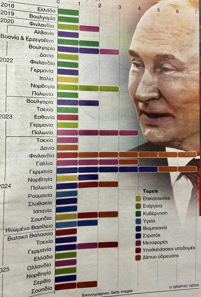 Τα δεδομένα του Διεθνούς Ινστιτούτου Στρατηγικών Μελετών (IISS) δείχνουν ότι τα επιβεβαιωμένα ρωσικά σαμποτάζ σε ζωτικής σημασίας υποδομές της Ευρώπης αυξήθηκαν κατά 246% από το 2023 έως το 2024, με τις δολιοφθορές σε υποθαλάσσια καλώδια στη Βαλτική να αποκαλύπτουν μεταξύ άλλων την ευαλωτότητα της ευρωπαϊκής ψηφιακής οικονομίας.