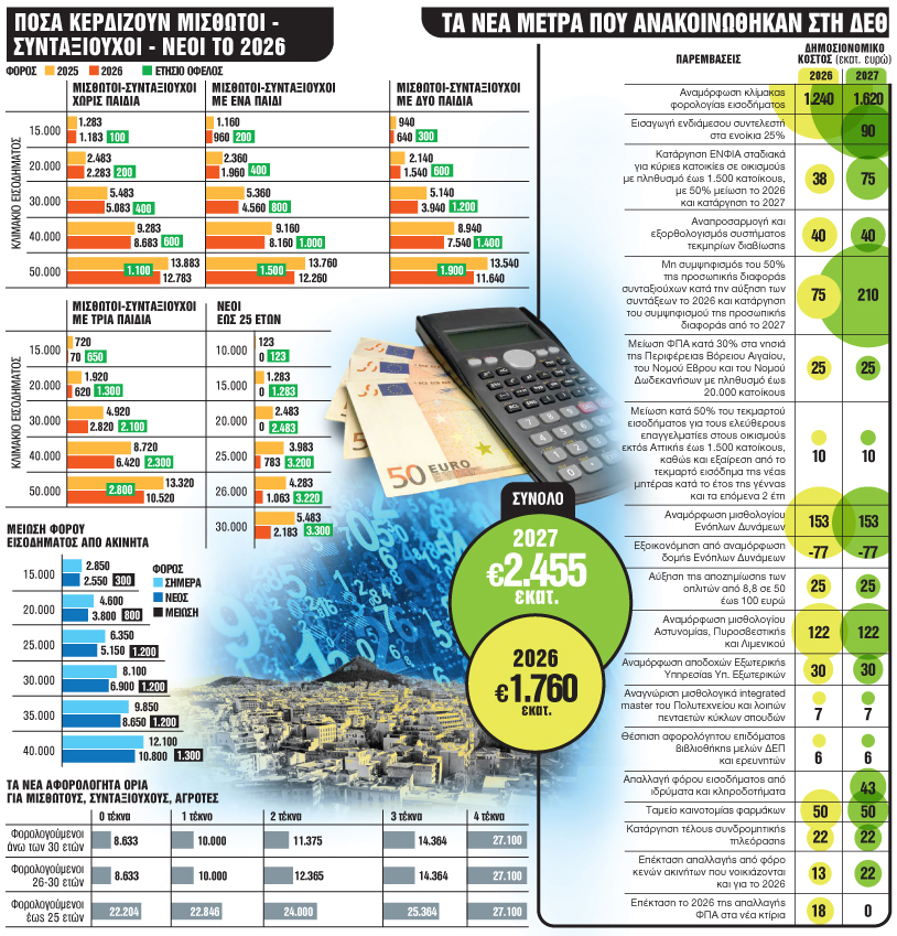 Αυξήσεις στα εισοδήματα που φτάνουν ακόμα και τους δύο μισθούς τον χρόνο φέρνουν σε περίπου 4 εκατ. φορολογουμένους η νέα φορολογική κλίμακα και τα αφορολόγητα όρια που θα ισχύσουν από το 2026.