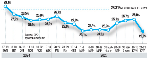 - Πρώτον, το έκανε διότι στο Μαξίμου διαπιστώνουν πλέον ότι οι δυσμενείς τάσεις στην κοινωνία δεν επιτρέπουν κάτι διαφορετικό. Αντίθετα, τα σκαμπανεβάσματα της ΝΔ σε έναν χρόνο (από την κάλπη του Ιουνίου του 2024 έως το φετινό καλοκαίρι), παρά την υπεροχή της, επιβεβαιώνουν την αδυναμία να απεγκλωβιστεί από ένα περιβάλλον πύρρειου νίκης: δεν έχει έρθει το «άλμα», παραδέχονται κυβερνητικά στελέχη, που θα άνοιγε ρεαλιστικά τροχιά διεκδίκησης αυτοδυναμίας. Κρίθηκε, συνεπώς, ότι η προβολή της προσήλωσης Μητσοτάκη στην αυτοδυναμία μπορεί να γυρνάει μπούμερανγκ και να εκληφθεί ως άλλο ένα δείγμα αυταρέσκειας ενόσω η κυβερνητική μηχανή δείχνει έτσι κι αλλιώς κουρασμένη μπροστά σε άλυτα προβλήματα και σε δικά της λάθη που λειτουργούν σωρευτικά. Τα (όποια) δημοσκοπικά κέρδη της κυβέρνησης χάνονται πλέον γρήγορα: η άνοδος με τις «πασχαλινές» ανακοινώσεις Μητσοτάκη για την επιστροφή ενοικίου κάθε Νοέμβριο, ύστερα από την κατρακύλα λόγω Τεμπών, κράτησε λίγο και τελικά χάθηκε με τις αποκαλύψεις και τους κυβερνητικούς χειρισμούς στο σκάνδαλο του ΟΠΕΚΕΠΕ.