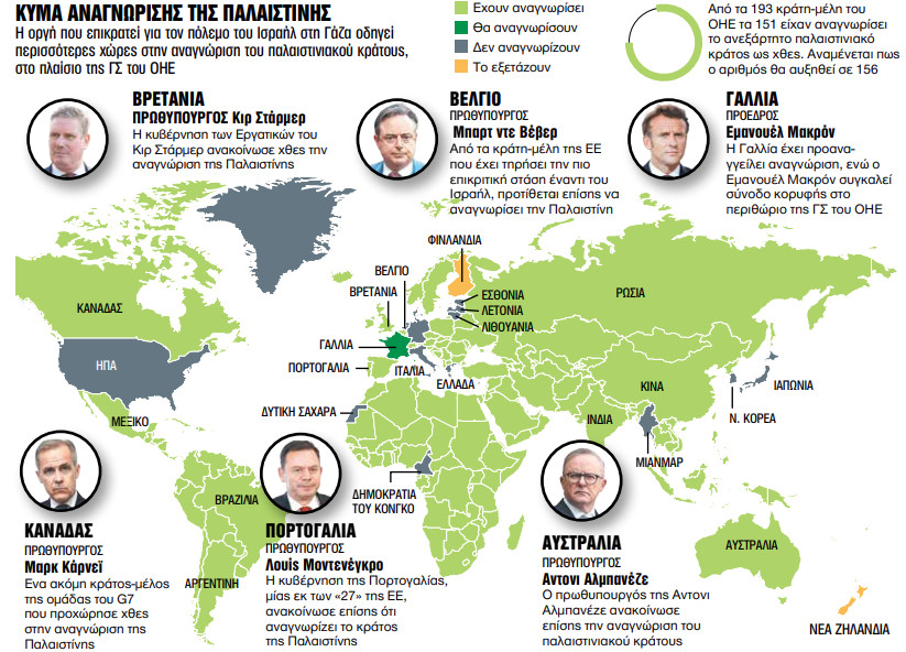 Αξίζει να σημειωθεί πως ο αριθμός των κρατών που αναγνωρίζουν την Παλαιστίνη έχει ήδη φτάσει τα 150 – εκ των οποίων δύο μέλη του G7 (Καναδάς και Ηνωμένο Βασίλειο) –, ενώ αναμένεται ως το τέλος της εβδομάδας να ανέλθει σε 156. Κάτι που σημαίνει, πρακτικά, ότι θα αντιπροσωπεύουν το 80% του συνόλου. Παρ’ όλα αυτά, το βέτο των Ηνωμένων Πολιτειών εξακολουθεί να εμποδίζει την επίσημη ένταξη της Παλαιστίνης στους κόλπους του ΟΗΕ.