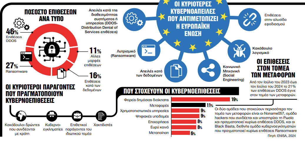 Αυτή είναι η εικόνα που προκύπτει και από τα στοιχεία του ENISA: 19% φορείς δημόσιας διοίκησης, 11% μεταφορές, 9% χρηματοπιστωτικές υπηρεσίες, 9% ψηφιακές υποδομές, 8% επιχειρήσεις, 8% ευρύ κοινό και 6% μεταποίηση. Εχει ενδιαφέρον η κατάσταση με τον τομέα των μεταφορών, που είναι ο δεύτερος σε στοχοποίηση. Από τον Ιούλιο του 2023 έως τον Ιούλιο του 2024 το 21% των επιθέσεων DDOS στην ΕΕ έγινε στον τομέα των μεταφορών. Οι δύο ομάδες που στοχεύουν περισσότερο τον τομέα των μεταφορών στην Ευρώπη είναι οι Noname057, ομάδα hackers που συνδέεται και υποστηρίζει τη Ρωσία και πραγματοποιεί κυρίως επιθέσεις DDOS και οι Black Basta, διεθνής ομάδα κυβερνοεγκληματιών που πραγματοποιεί κυρίως επιθέσεις Ransomware.