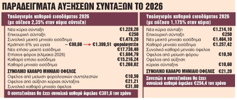 Οι συντάξεις Ιανουαρίου θα καταβληθούν πριν από τα Χριστούγεννα με τις νέες αυξήσεις. Οσοι δεν έχουν προσωπική διαφορά θα δουν αύξηση. Οι περίπου 670.000 συνταξιούχοι με προσωπική διαφορά θα πάρουν το 50% της αύξησης, ώστε να εξισωθούν πλήρως ως το 2027. Ειδικότερα, τρεις κατηγορίες συνταξιούχων θα λάβουν την αύξηση του 2026, η οποία υπολογίζεται με βάση τις σημερινές οικονομικές εκτιμήσεις σε 2,6%-2,7%, ενώ θα υπάρξουν και 670.000 συνταξιούχοι που θα λάβουν αύξηση 1,3%-1,35%. Eτσι, την αύξηση του 2026 θα πάρουν: