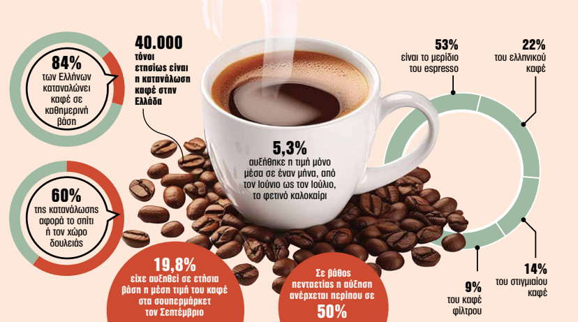 Την ώρα, όμως, που οι εκλεκτοί κόκκοι καφέ έχουν καταλήξει να είναι πολύ παραπάνω από ένα ακόμη προϊόν στο ράφι, η ραγδαία αύξηση της τιμής του έχει γίνει αισθητή σε όλες τις εκφάνσεις του, τείνοντας να τον καταστήσει είδος πολυτελείας. Από το ράφι του σουπερμάρκετ – όπου η αύξηση τον Σεπτέμβριο, σε ετήσια βάση, είχε φτάσει το 19,8% σύμφωνα με την ΕΛΣΤΑΤ – μέχρι το καφεκοπτείο της γειτονιάς, την take away καφετέρια, αλλά και το τραπέζι, οι τιμές αυξάνονται διαρκώς. Αποτέλεσμα; Η άλλοτε προσιτή απόλαυση, ενός – ή και παραπάνω – καφέδων τη μέρα, να γίνεται ένα υπολογίσιμο έξοδο.
