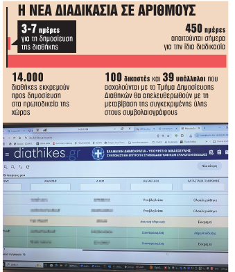 Με λίγα «κλικ» από τον ηλεκτρονικό υπολογιστή του σπιτιού τους, μέσα σε χρονικό διάστημα από 3 έως 7 ημέρες, θα μπορούν όλοι ανεξαιρέτως οι πολίτες από την 1η Νοεμβρίου 2025, μέσω της ψηφιακής πλατφόρμας diathikes.gr, να έχουν στα χέρια τους δημοσιευμένη τη διαθήκη που τους αφορά και όλα τα σχετικά πιστοποιητικά.
