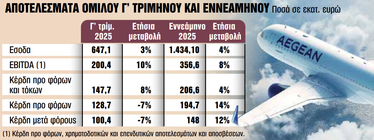 Στο εννεάμηνο, τα κέρδη EBITDA της Aegean διαμορφώθηκαν σε €356,6 εκατ., αυξημένα κατά 8% σε σχέση με την αντίστοιχη περίοδο του 2024, ενώ τα κέρδη προ φόρων ανήλθαν στα €194,7 εκατ. αυξημένα κατά 14% συγκριτικά με το εννεάμηνο του 2024. Τα κέρδη έπειτα από φόρους για το εννεάμηνο ανήλθαν σε €148 εκατ., παρουσιάζοντας άνοδο 12% σε σχέση με την περσινή περίοδο.