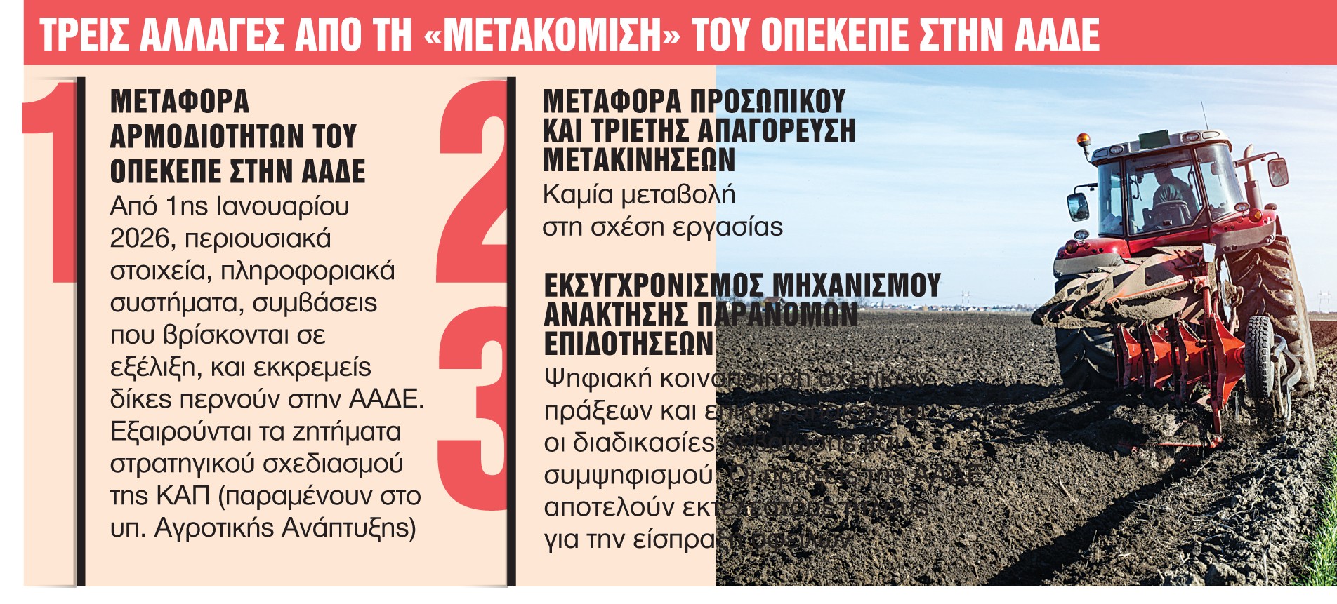 Με την έγκριση από την Κομισιόν του νέου σχεδίου δράσης για τις αγροτικές επιδοτήσεις, οι ενισχύσεις θα κατανέμονται με βάση τα πραγματικά δεδομένα του κάθε αγρότη και κτηνοτρόφου«ώστε από εδώ και πέρα να μην έχουμε νέες εμπλοκές σε πληρωμές ή νέα πρόστιμα προς τη χώρα», όπως σημειώνουν κυβερνητικές πηγές. Το νέο σχέδιο δράσης για τις αγροτικές επιδοτήσεις συνδυάζεται με τη μετάβαση του ΟΠΕΚΕΠΕ στην ΑΑΔΕ, η οποία περιγράφεται στο νομοσχέδιο του υπουργείου Εθνικής Οικονομίας και Οικονομικών, το οποίο χθες τέθηκε σε δημόσια διαβούλευση. Επίσης, καθορίζονται οι προδιαγραφές με τις οποίες θα λειτουργεί το νέο σύστημα διαχείρισης και ελέγχου το 2026, ενώ προβλέπεται ένα υβριδικό μεταβατικό σύστημα για το 2025.