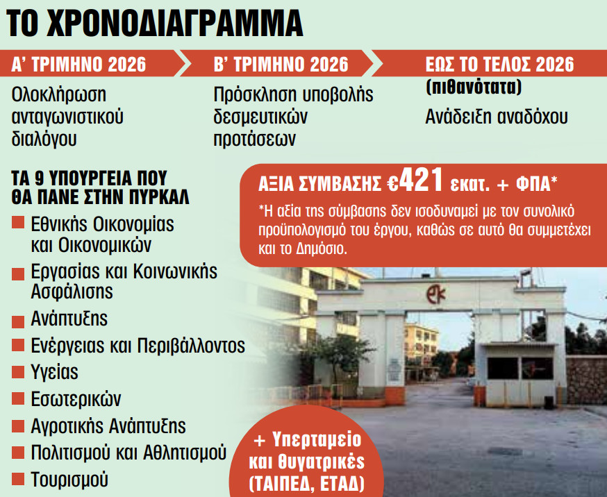 Προς το τέλος της οδεύει η διαδικασία του ανταγωνιστικού διαλόγου για τη μεγαλύτερη Σύμπραξη Δημόσιου και Ιδιωτικού Τομέα (ΣΔΙΤ) στην Ελλάδα, τη δημιουργία του κυβερνητικού πάρκου «Ανδρέας Λεντάκης» στις εγκαταστάσεις της πρώην ΠΥΡΚΑΛ, στον Δήμο Δάφνης – Υμηττού. Σύμφωνα με πηγές του Υπερταμείου, η διαδικασία του ανταγωνιστικού διαλόγου θα ολοκληρωθεί μέσα στο πρώτο τρίμηνο του 2026, ενώ στη συνέχεια, μεταξύ Απριλίου και Ιουνίου, θα ανοίξει η πλατφόρμα υποβολής δεσμευτικών προσφορών.