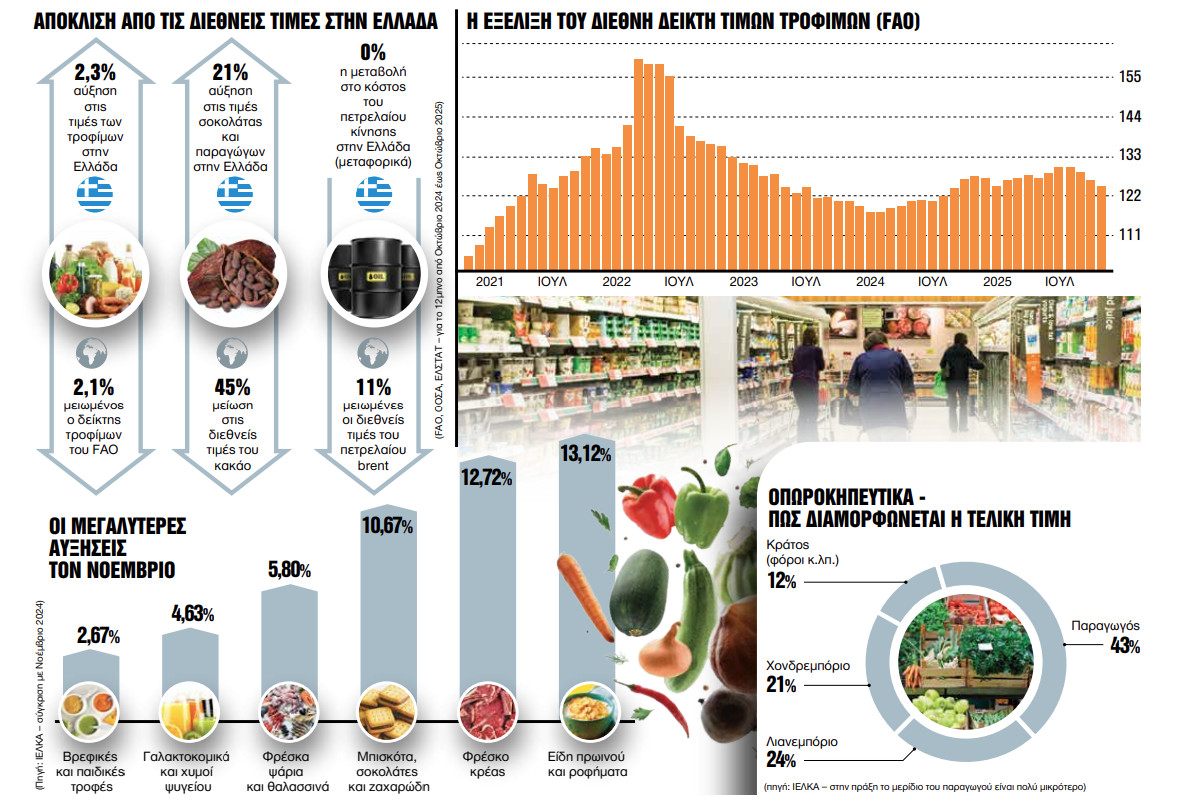 Τι συμβαίνει, όμως, στην Ελλάδα; Εδώ και για μία ακόμη φορά οι δείκτες ακολουθούν αντίθετη φορά σε σύγκριση με τις διεθνείς τάσεις. Ετσι, πάντα με βάση την ΕΛΣΤΑΤ, τον Οκτώβριο οι τιμές στα είδη διατροφής και τα μη αλκοολούχα ποτά ήταν αυξημένες κατά 0,9% έναντι του Σεπτεμβρίου, όταν ο δείκτης του FAO στο ίδιο διάστημα υποχώρησε κατά 1,6%.