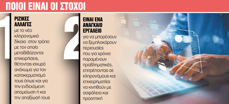 Το νέο κληρονομικό δίκαιο που παρουσιάστηκε την προηγούμενη εβδομάδα από την πολιτική ηγεσία του υπουργείου Δικαιοσύνης, όπως επισημάνθηκε σε όλους τους τόνους, εκτός από τις αλλαγές που αφορούν τη μοιρασιά της περιουσίας για μια οικογένεια, φέρνει ριζικές αλλαγές και στον τρόπο με τον οποίο μεταβιβάζονται επιχειρήσεις, θέτοντας ισχυρό ανάχωμα για τον κατακερματισμό τους όπως και για την ενδεχόμενη απομείωση ή και την απαξίωσή τους.