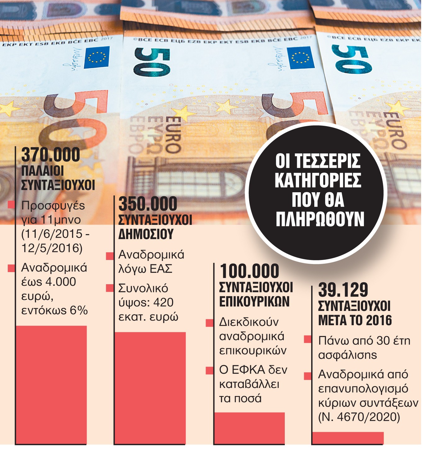 1. Αναδρομικά 11μηνου: Την καταβολή αναδρομικών έως 4.000 ευρώ για το 11μηνο μεταξύ 11 Ιουνίου 2015 και 12 Μαΐου 2016 εξακολουθεί να αναμένει ένα ποσοστό συνταξιούχων, λόγω γραφειοκρατικών καθυστερήσεων – ακόμα και με καθυστέρηση δύο ετών. Τα ποσά αυτά αφορούν κυρίως περικοπές σε κύριες και επικουρικές συντάξεις καθώς και στα δώρα, σύμφωνα με την απόφαση της Ολομέλειας του ΣτΕ του 2020. Τα αναδρομικά δικαιούνται περίπου 370.000 συνταξιούχοι που είχαν προσφύγει στη Δικαιοσύνη και κερδίζουν στα Πρωτοδικεία, αφού ο ΕΦΚΑ δεν ασκεί εφέσεις. Εκτός διεκδικήσεων έμειναν οριστικά συνταξιούχοι που δεν κατέθεσαν προσφυγές. Οι συνταξιούχοι που κατέθεσαν προσφυγές παίρνουν τα αναδρομικά με τόκους ως και 7 ετών. Οι τόκοι μπορεί να φτάσουν ή και να ξεπεράσουν τα 1.000 ευρώ ανάλογα με το ύψος των αναδρομικών, καθώς υπολογίζονται από την ημερομηνία κατάθεσης της αγωγής μέχρι την ημερομηνία εξόφλησης. Τα αναδρομικά του 11μήνου καταβάλλονται με τόκο 6%. Σύμφωνα με εργατολόγους που χειρίζονται αυτές τις υποθέσεις, ένα 5%, δηλαδή περίπου 10.000-20.000 δικαιούχοι, έχουν εισπράξει ποσά τα οποία κυμαίνονται από 2.500 έως 3.000 ευρώ συν τους τόκους 6%.