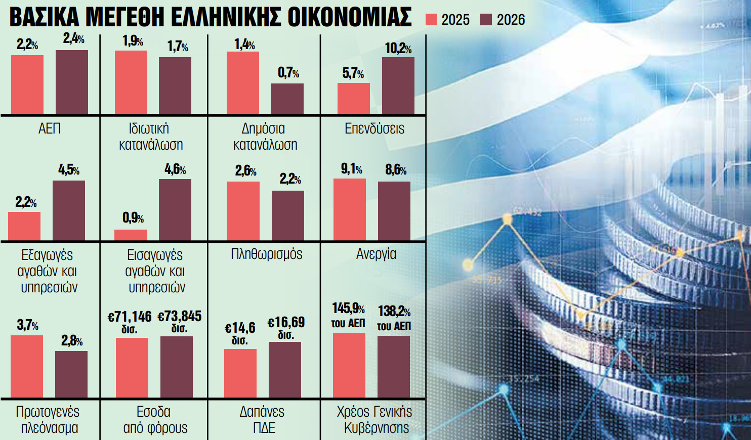 Σε ονομαστικούς όρους οι επενδύσεις θα ανέλθουν το 2026 σε ποσοστό 17,7% του ΑΕΠ, έναντι 21% στην ΕΕ, μειώνοντας το επενδυτικό κενό. Το επόμενο έτος, το ονομαστικό ΑΕΠ θα είναι 260 δισ. ευρώ ενώ σημαντικά αυξάνονται και οι δαπάνες. Οι καθαρές, εθνικά χρηματοδοτούμενες, πρωτογενείς δαπάνες που μετράει η ΕΕ αυξάνονται 5,7% με τις δαπάνες γενικής κυβέρνησης να φτάνουν συνολικά σχεδόν στα 130 δισ. ευρώ, δηλαδή αντιστοιχούν περίπου στο 50% του ΑΕΠ. Μόνο η συνταξιοδοτική δαπάνη ανέρχεται σε 35,6 δισ. ευρώ, ενώ οι μισθοί των δημοσίων υπαλλήλων είναι 24-25 δισ. ευρώ.