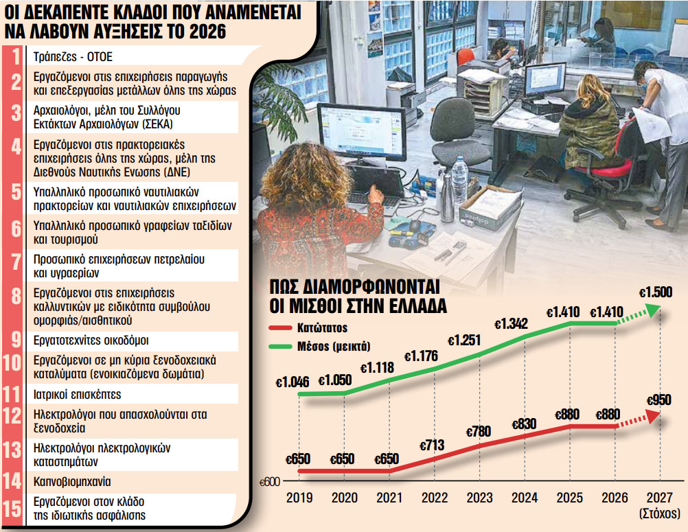 Δεδομένου ότι οι κλαδικοί μισθοί είναι πάντα υψηλότεροι από τον κατώτατο, οι νέες ρυθμίσεις θα σημάνουν αυξήσεις για δεκάδες χιλιάδες εργαζομένους σταδιακά μέσα στο 2026.