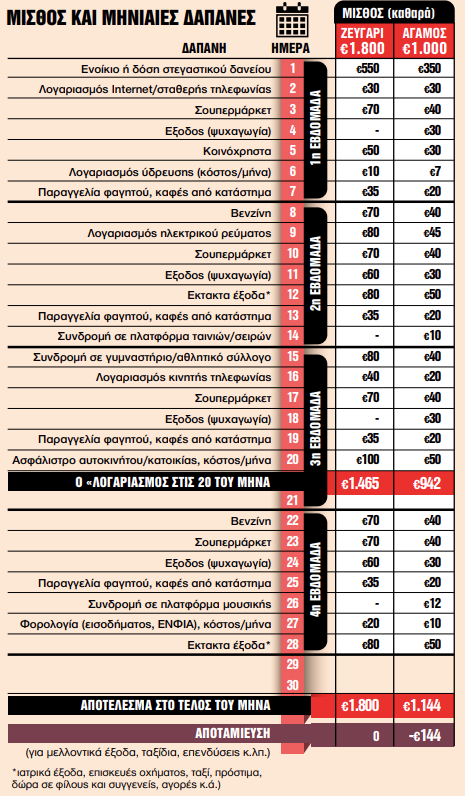 Ούτε για τα ζευγάρια η κατάσταση είναι πολύ ευκολότερη. Με καθαρά έσοδα 1.800 ευρώ (1.000 + 800 ευρώ καθαρά), ένα ζευγάρι φτάνει στο τέλος του μήνα με άδειο πορτοφόλι – κι αυτό, κάνοντας σημαντικές περικοπές στα «μη απαραίτητα» έξοδα, όπως είναι η… ψυχαγωγία. Η δυσκολία αυξάνεται στην περίπτωση που το ίδιο ζευγάρι θέλει να αποκτήσει ή έχει παιδιά, γεγονός που συμβάλλει αρνητικά στο δημογραφικό.