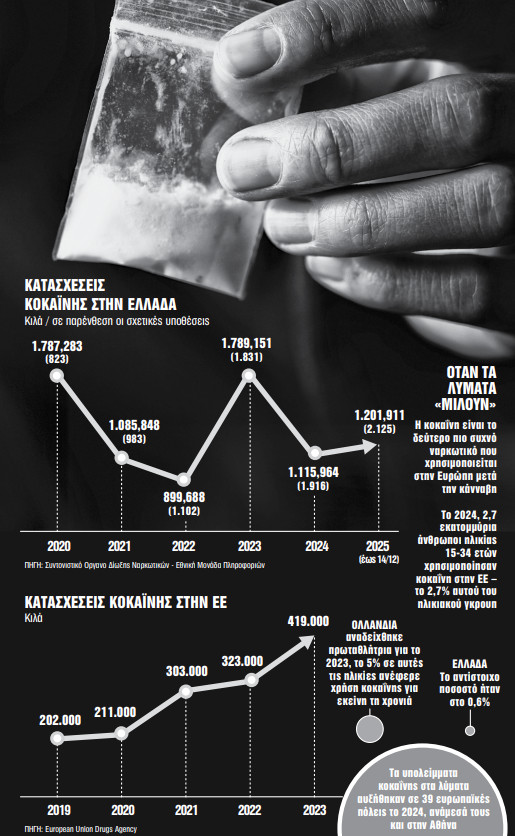 Οι αριθμοί φαίνεται να επιβεβαιώνουν τους φόβους. Με βάση τα τελευταία επίσημα διαθέσιμα στοιχεία (δημοσιεύτηκαν τον Ιούνιο του 2025 από τον Οργανισμό της Ευρωπαϊκής Ενωσης για τα Ναρκωτικά), το 2023 ήταν χρονιά – ρεκόρ για κατασχέσεις κοκαΐνης στα κράτη της ΕΕ. Για την ακρίβεια, ήταν η έβδομη συνεχόμενη χρονιά που «έσπασε» το αντίστοιχο ρεκόρ, με συνολικά 95.000 κατασχέσεις, που αντιστοιχούν σε 419 τόνους της ναρκωτικής ουσίας. Πρωταθλητές αναδείχθηκαν το Βέλγιο (123 τόνοι), η Ολλανδία (60 τόνοι) και η Ισπανία (118 τόνοι), αποτελώντας αθροιστικά το 72% της συνολικής κατασχεθείσας ποσότητας. Ακολούθησαν χώρες όπως η Γερμανία (43 τόνοι), η Γαλλία (23 τόνοι) και η Πορτογαλία (22 τόνοι).
