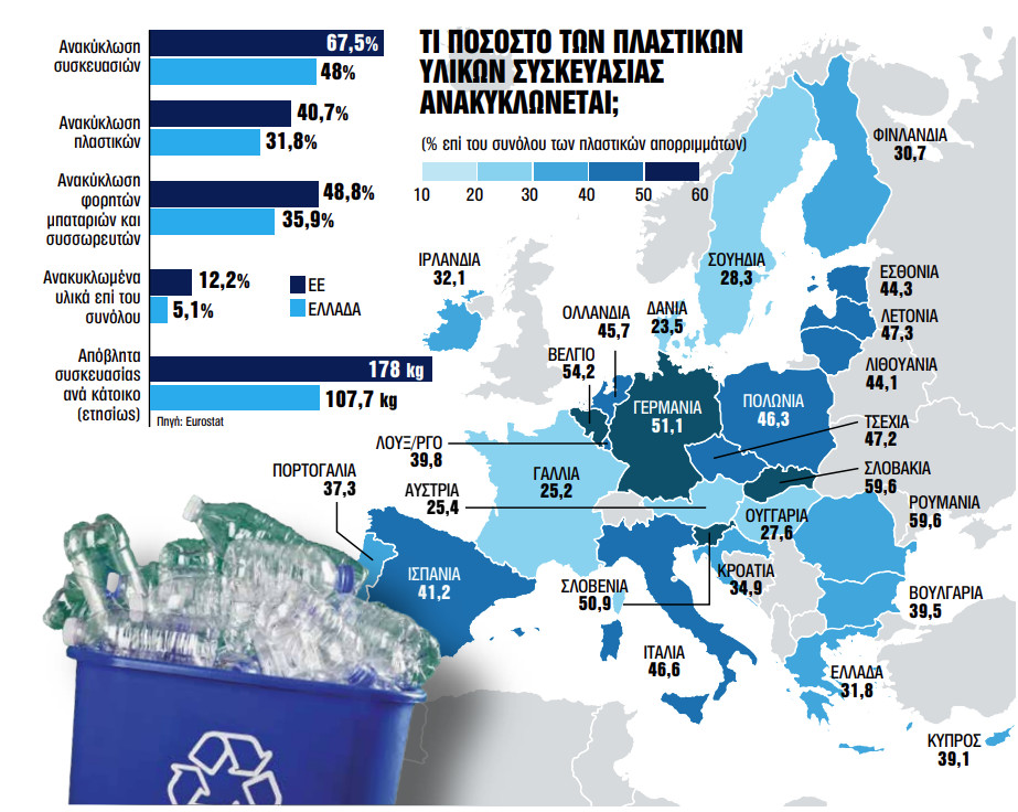 Ιδιαίτερα ανησυχητική είναι η εικόνα στο πλαστικό, καθώς το ποσοστό ανακύκλωσης συσκευασιών που ανήκουν σε αυτή την κατηγορία στη χώρα μας ανήλθε μόλις στο 32,7%, δηλαδή πολύ κάτω από τον στόχο του 55%. Την ίδια στιγμή, σε επίπεδο ΕΕ, ο μέσος όρος ανακύκλωσης πλαστικού βρίσκεται στο 42,1%, με χώρες όπως η Γερμανία και η Ολλανδία να ξεπερνούν ήδη το 50%.