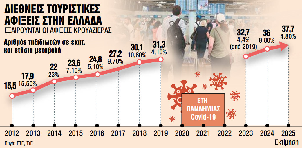 Τα συνολικά τουριστικά έσοδα του δεκαμήνου άγγιξαν τα 22,4 δισ. ευρώ από 35,3 εκατ. ταξιδιώτες, σύμφωνα με τα στοιχεία της ΤτΕ. Από τη Γερμανία ήρθαν οι περισσότεροι τουρίστες, με τις αφίξεις να αγγίζουν τα 5,7 εκατ., ενώ οι δαπάνες των Γερμανών στην Ελλάδα ξεπέρασαν τα 3,6 δισ. ευρώ (630 ευρώ ανά ταξίδι). Στη δεύτερη θέση έρχονται οι Βρετανοί, με σχεδόν 4,7 εκατ. τουρίστες και δαπάνες που ξεπέρασαν τα 3,5 δισ. ευρώ (755 ευρώ ανά ταξίδι). Οι τουρίστες από τις ΗΠΑ συνέχισαν να αυξάνονται (+2%) και ανήλθαν σε 1,4 εκατ., δαπανώντας συνολικά περισσότερα από 1,5 δισ. ευρώ (1.104 ευρώ ανά ταξίδι). Ελαφρώς μειώθηκαν (-2%), από την άλλη, οι αφίξεις ταξιδιωτών από τη Γαλλία, που ανήλθαν σε 1,9 εκατ. και ξόδεψαν 1,3 δισ. ευρώ (686 ευρώ ανά ταξίδι).