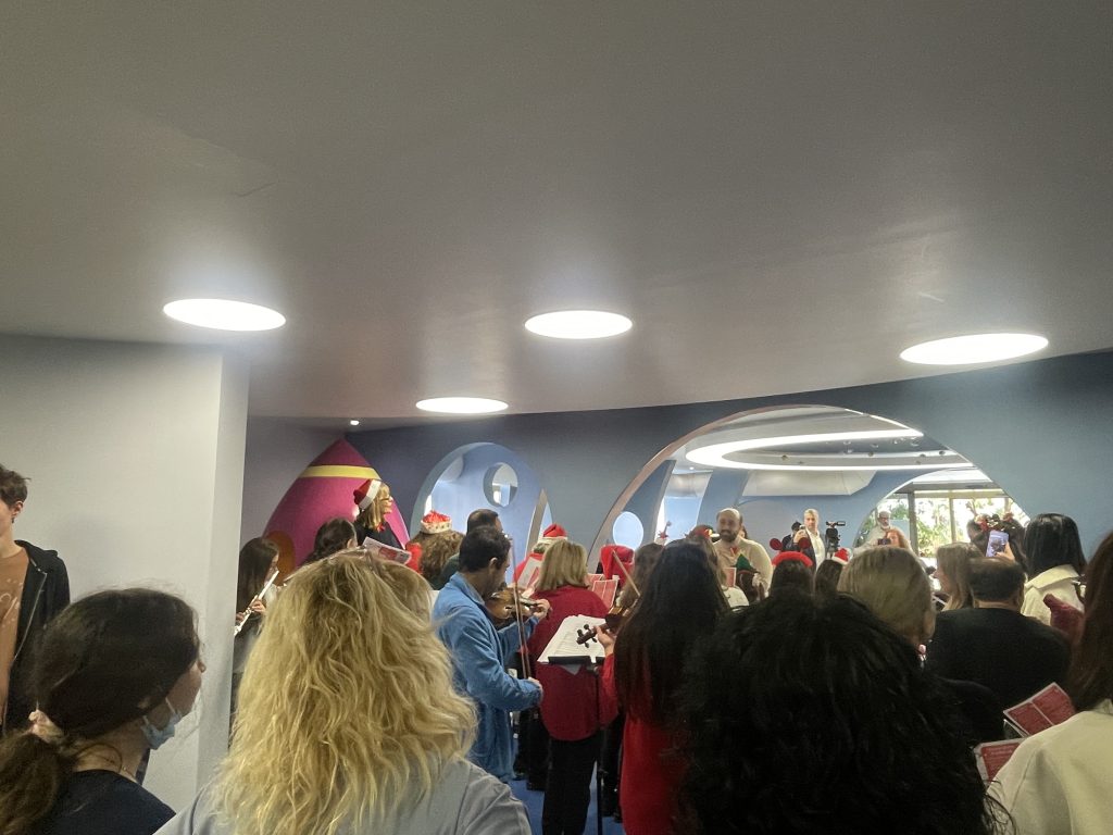 Στη μία πλευρά υπήρχαν καθίσματα που προορίζονταν για τους μικρούς συνανθρώπους μας και στην άλλη, χριστουγεννιάτικα εδέσματα και λιχουδιές που, έστω και στιγμιαία, κατάφερναν να παραπλανήσουν τους παρευρισκόμενους και να τους κάνουν να ξεχάσουν πού βρίσκονταν. Στη μέση του χώρου στέκονταν οι μουσικοί και η χορωδία για να παίξουν και να τραγουδήσουν κάποιες από τις πιο κλασικές μελωδίες αυτών των ημερών.