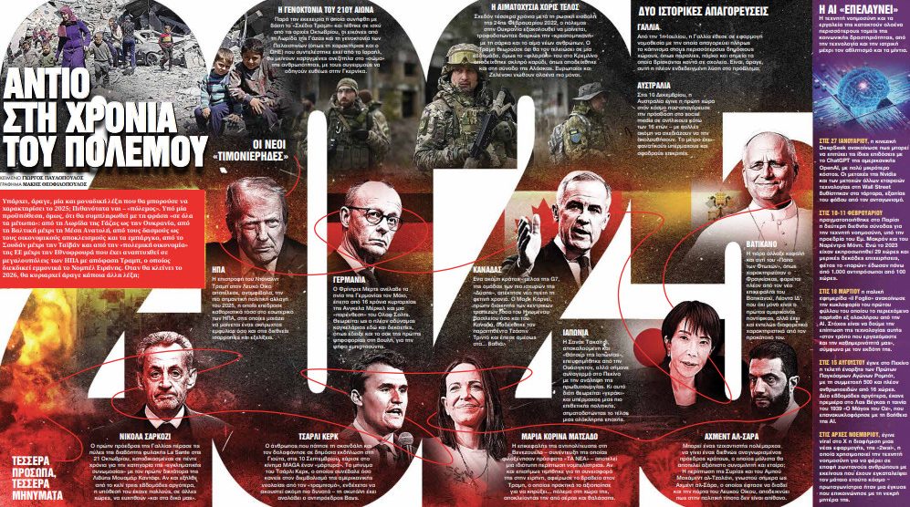 Υπάρχει, άραγε, µία και µοναδική λέξη που θα µπορούσε να χαρακτηρίσει το 2025; Πιθανότατα ναι – «πόλεµος». Υπό µία προϋπόθεση, όµως, ότι θα συµπληρωθεί µε τη φράση «σε όλα τα µέτωπα»: από τη Λωρίδα της Γάζας ως την Ουκρανία, από τη Βαλτική µέχρι τη Μέση Ανατολή, από τους δασµούς ως τους οικονοµικούς αποκλεισµούς και τα εµπάργκο, από το Σουδάν µέχρι την Ταϊβάν και από την «πολεµική οικονοµία» της ΕΕ µέχρι την Εθνοφρουρά που έχει αναπτυχθεί σε µεγαλουπόλεις των ΗΠΑ µε απόφαση Τραµπ, ο οποίος διεκδικεί εµµονικά το Νοµπέλ Ειρήνης. Οταν θα κλείνει το 2026, θα κυριαρχεί άραγε κάποια άλλη λέξη;