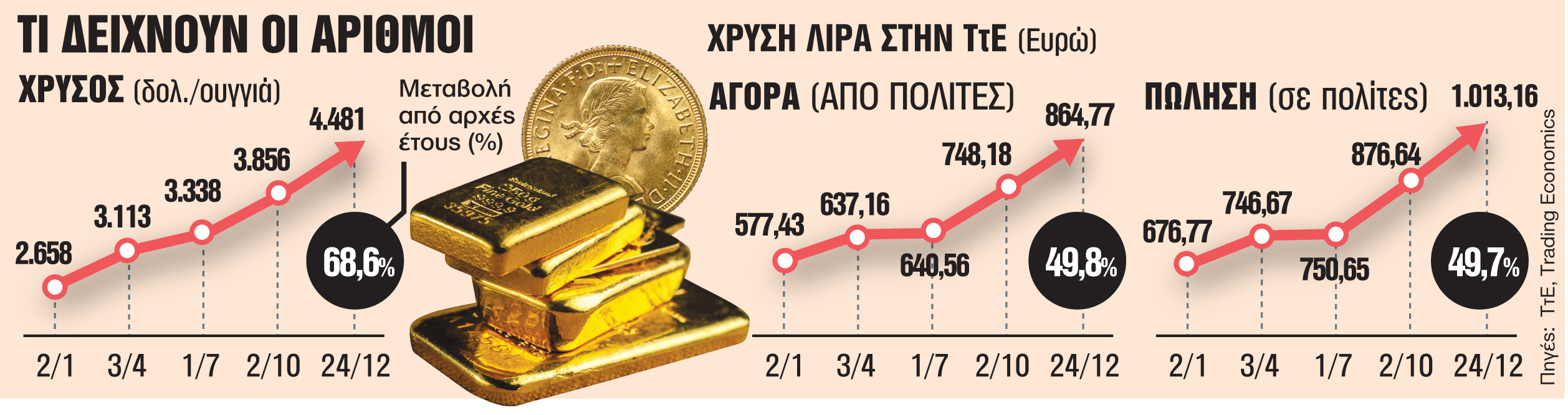 Ξεπέρασε τα 4.500 δολάρια η ουγγιά του χρυσού στις διεθνείς αγορές την επομένη των Χριστουγέννων (26/12), καταγράφοντας ακόμα ένα ρεκόρ μέσα στο 2025. Συγκεκριμένα, η τιμή του χρυσού διαμορφώθηκε στα 4.532,2 δολάρια η ουγγιά. Ως αποτέλεσμα της ανόδου της τιμής του χρυσού, συνεχιζόμενες αυξήσεις παρατηρούνται και στην τιμή της χρυσής λίρας, που είναι η βασική επιλογή που έχουν οι Ελληνες στην αγορά επενδυτικού χρυσού. Την παραμονή των Χριστουγέννων, η τιμή αγοράς χρυσής λίρας από την ΤτΕ για έναν πολίτη διαμορφωνόταν στα 1.013,16 ευρώ, ξεπερνώντας για πρώτη φορά το ορόσημο των 1.000 ευρώ.