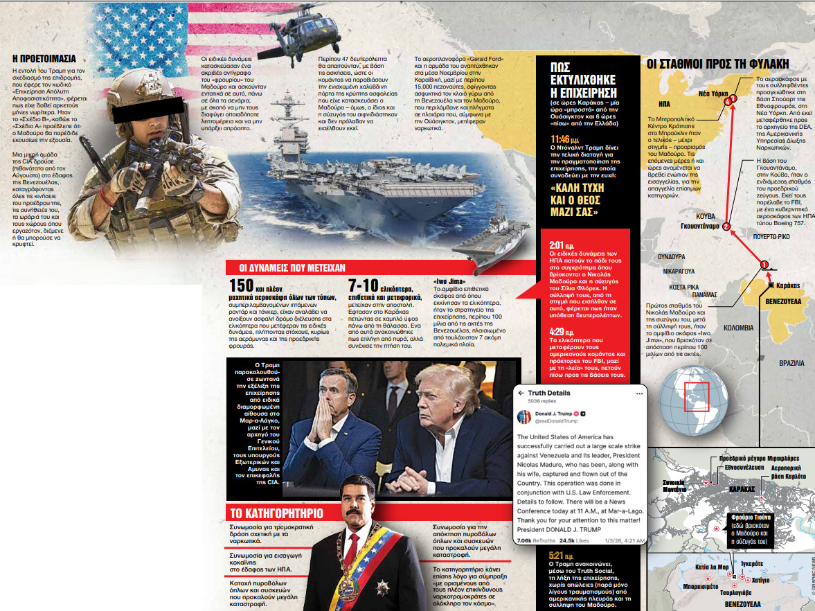 Υπάρχει, όμως, κάτι ακόμη που πρέπει να θεωρείται δεδομένο. Η «Επιχείρηση Απόλυτη Αποφασιστικότητα» αποτελεί την πιο ατράνταχτη, μέχρι στιγμής τουλάχιστον, απόδειξη πως έχουμε εισέλθει για τα καλά στην εποχή Τραμπ. Σε μια περίοδο, δηλαδή, στην οποία έννοιες όπως διεθνές δίκαιο ή εδαφική ακεραιότητα μοιάζουν να είναι… μπανάλ και να αντιμετωπίζονται ως βαρίδι στην άγρια αναμέτρηση για το ξαναμοίρασμα των σφαιρών επιρροής και, τελικά, ολόκληρου του κόσμου. Είναι κάτι που αναγνωρίζουν – με τις πράξεις τους – ακόμη και εκείνοι που έσπευσαν να καταδικάσουν την επιδρομή στο Καράκας, όπως η Ρωσία και η Κίνα.