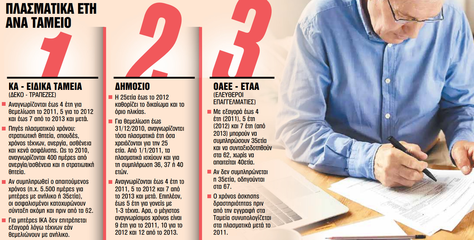 Το κλειδί που δίνουν τα πλασματικά έτη για γρήγορη έξοδο από τον ΕΦΚΑ είναι ότι με αυτά συμπληρώνεται ο απαιτούμενος χρόνος ασφάλισης έως το 2012, που για τους παλαιούς πριν από το 1993 ασφαλισμένους καθορίζει και την ηλικία που θα πάρουν σύνταξη.