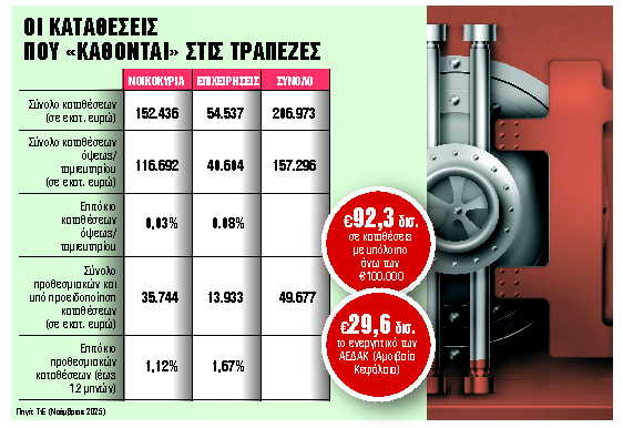 Σημαντικό μέρος των χρήματων νοικοκυριών και επιχειρήσεων βρίσκονται «εγκλωβισμένα» σε καταθέσεις μίας ημέρας, με επιτόκια 0,03% για τα νοικοκυριά και 0,08% για τις επιχειρήσεις. Οι καταθέσεις αυτές δεν αβγατίζουν ούτε για τους κατόχους τους, αλλά ούτε και για τις τράπεζες, οι οποίες δεν μπορούν να τις χρησιμοποιήσουν για να χρηματοδοτήσουν την οικονομία. Σύμφωνα με στοιχεία του Ταμείου Εγγύησης Καταθέσεων και Επενδύσεων (ΤΕΚΕ) για το 2024, περίπου 92,5 δισ. ευρώ (44% των καταθέσεων) βρίσκονται σε λογαριασμούς με υπόλοιπο άνω των 100.000 ευρώ.