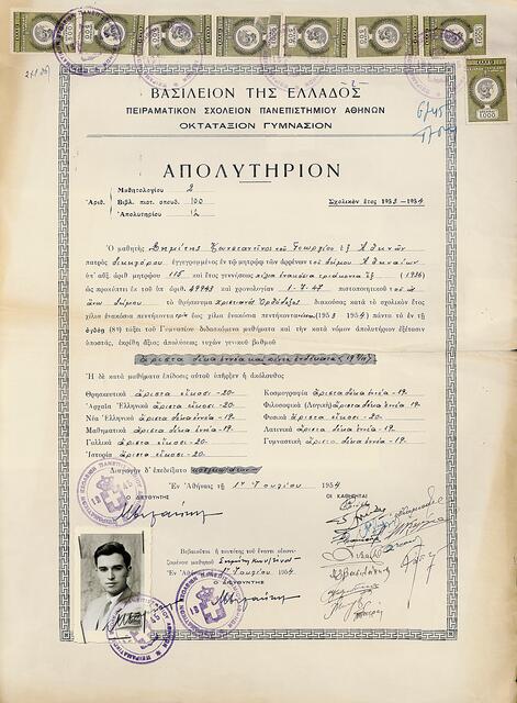1954. Το απολυτήριο του Κώστα Σημίτη από το Πειραματικό Γυμνάσιο του Πανεπιστημίου Αθηνών με 19 και 5/11