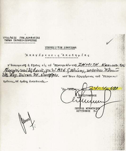 24 Απριλίου 1968 δίνεται εντολή απαγόρευσης εξόδου από τη χώρα