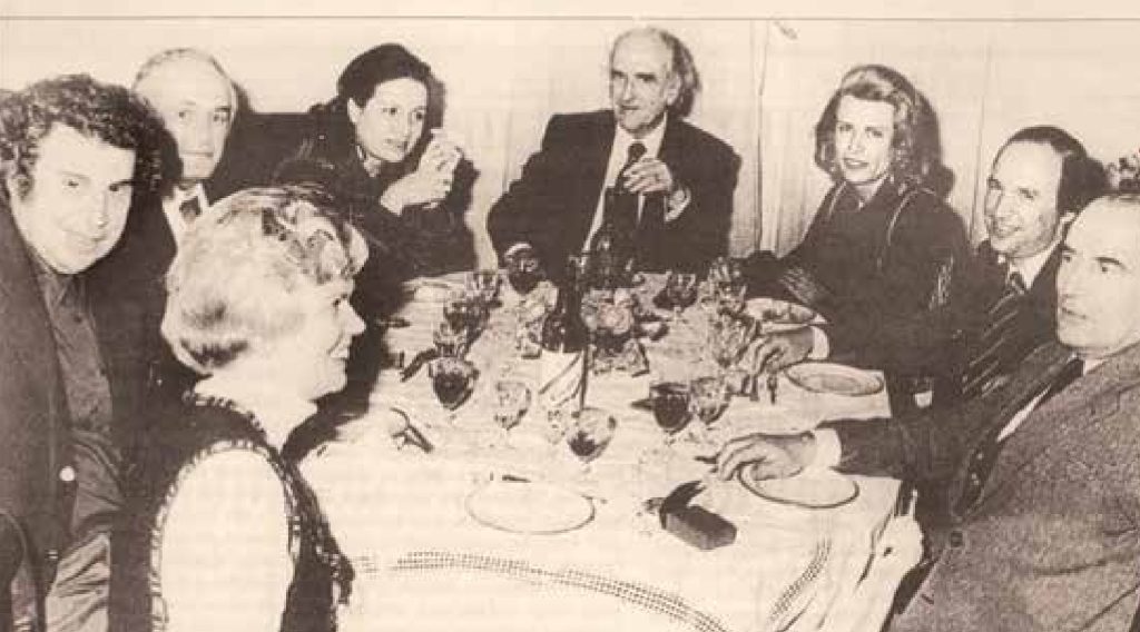 Σε δείπνο στο Καστρί προς τιμήν του γάλλου προέδρου Φρανσουά Μιτεράν (πρώτος από δεξιά) μαζί με τους (από αριστερά): Μαργαρίτα Παπανδρέου, Μίκη Θεοδωράκη, Κάρολο Παπούλια, τη γραμματέα του γάλλου προέδρου, Ανδρέα Παπανδρέου, Σύλβα Ακρίτα
