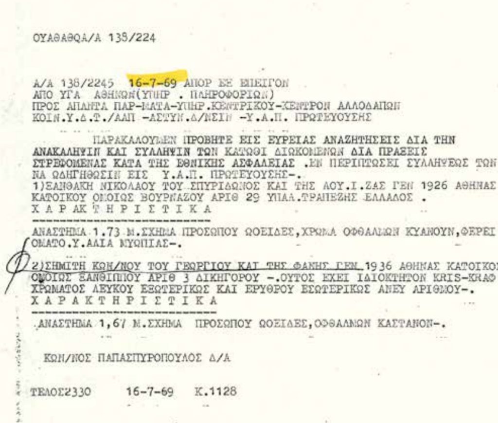 16 Ιουλίου του 1969 δίνεται εντολή να εντοπιστεί και να συλληφθεί ο Κώστας Σημίτης