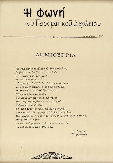 Ποίημα του Κώστα Σημίτη με τον τίτλο Δημιουργία στο σχολικό περιοδικό του Πειραματικού Γυμνασίου του Πανεπιστημίου Αθηνών τον Δεκέμβριο του 1953