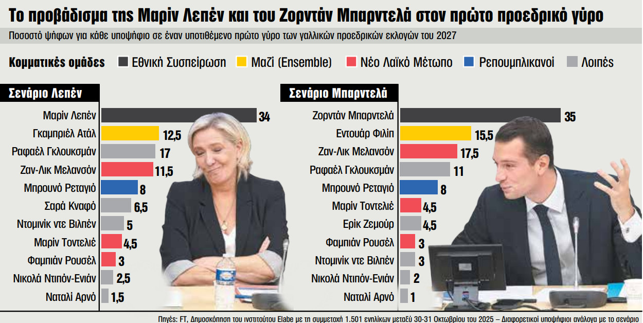 Δημοσκόπηση του ινστιτούτου Verian για την εφημερίδα «Le Monde» και το περιοδικό «L’Hémicycle» έδειξε πως ένα 49% των Γάλλων γενικά και ένα 70% των υποστηρικτών της RN ειδικότερα εκτιμά ότι ο Μπαρντελά «έχει περισσότερες πιθανότητες να κερδίσει τις προεδρικές εκλογές»: τα αντίστοιχα ποσοστά υπέρ της Λεπέν ήταν μόλις 18% και 20%. Ενα 56% των υποστηρικτών της RN, μάλιστα, φαίνονται πεπεισμένοι πως ο Μπαρντελά, παρά την πολιτική του απειρία, «θα ήταν καλύτερος πρόεδρος της Δημοκρατίας» από τη Λεπέν. Στο μεταξύ, άλλη δημοσκόπηση που είχε πραγματοποιήσει το ινστιτούτο Odoxa τον Νοέμβριο ήθελε τον Μπαρντελά να κερδίζει όχι μόνο τον πρώτο αλλά και τον δεύτερο προεδρικό γύρο, απέναντι σε όλους τους υποψηφίους – ο πιο «δυνατός» θα ήταν ο κεντρώος πρώην πρωθυπουργός του Εμανουέλ Μακρόν, Εντουάρ Φιλίπ, ο Μπαρντελά θα τον κέρδιζε εν τούτοις με 53%-47%.