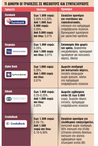 Το υψηλότερο επιτόκιο σε καταθετικούς λογαριασμούς στα πρώτα 1.000 ευρώ δίνει η ψηφιακή τράπεζα Snappi, με 3%. Εξάλλου, επιπλέον πλεονεκτήματα σε μισθωτούς και συνταξιούχους δίνουν και οι συνεταιριστικές τράπεζες της περιφέρειας (Χανίων, Ηπείρου, Θεσσαλίας, Καρδίτσας).
