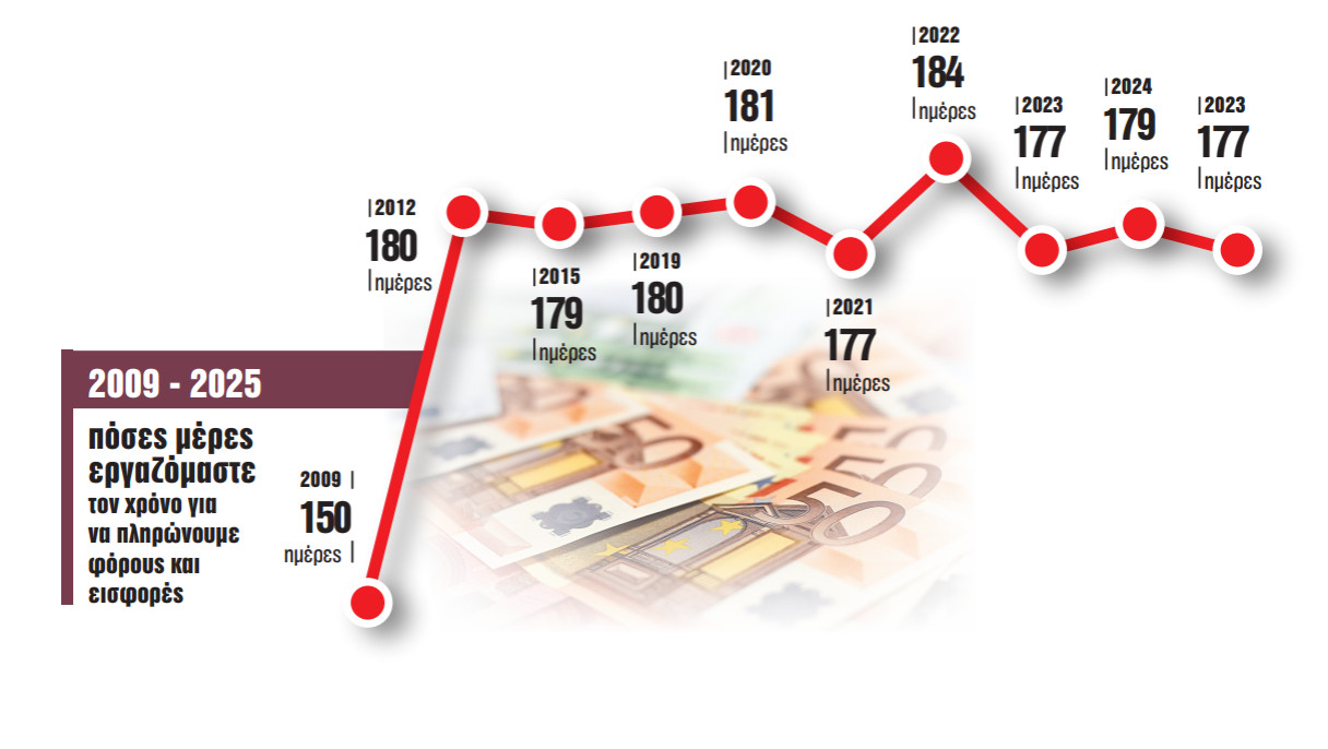 Από τις 365 ημέρες του έτους, οι Ελληνες, το 2025, εργάστηκαν τις 177 αποκλειστικά για το κράτος. Για να πληρώσουν, δηλαδή, τους φόρους και τις εισφορές της χρονιάς.