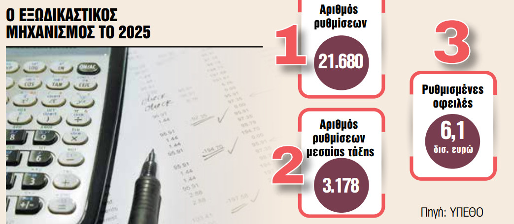 Η διεύρυνση των ανώτατων ορίων εισοδήματος και περιουσίας από τις 30 Απριλίου 2025 οδήγησε σε σημαντική ετήσια αύξηση (+25%) των ρυθμίσεων οφειλών μέσω του εξωδικαστικού μηχανισμού την περασμένη χρονιά. Οι συνολικές ρυθμίσεις του 2025 ανήλθαν σε 21.680, εκ των οποίων οι 3.178 (15%) αφορούσαν οφειλέτες της μεσαίας τάξης, που μπόρεσαν να προχωρήσουν σε ρύθμιση μέσω εξωδικαστικού μηχανισμού λόγω του διπλασιασμού των ορίων.