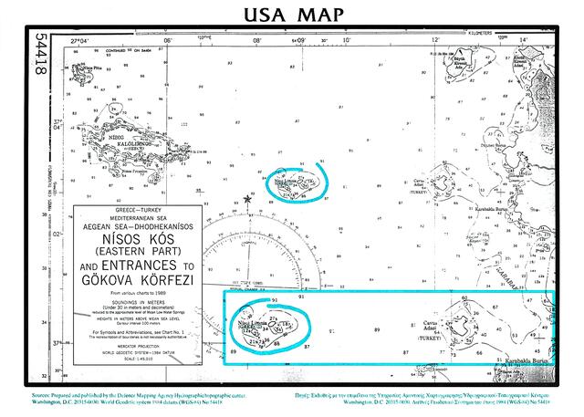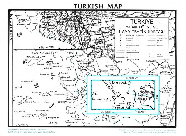 Xάρτης του Διεθνούς Οργανισμού Πολιτικής Αεροπορίας που εκδόθηκε στην Αγκυρα το 1953. Μέρος του χάρτη εκτός των τουρκικών συνόρων προέρχεται από τους χάρτες που είχε δημοσιεύσει η Πολεμική Αεροπορία των ΗΠΑ το 1994