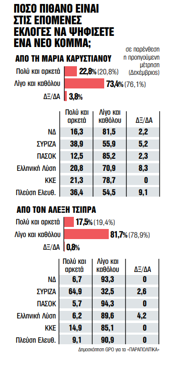 Ενα κόμμα και δύο υπό διαμόρφωση «κινήματα» κινούνται, τη δεδομένη στιγμή, στον κυκλώνα πολιτικών ανακατατάξεων και δημοσκοπικών ευρημάτων που διαμορφώνουν ένα θολό τοπίο στον χώρο της ευρύτερης αντιπολίτευσης. Στην τελευταία δημοσκόπηση της GPO (για τα «Παραπολιτικά»), το ΠΑΣΟΚ έρχεται δεύτερο, όμως χάνει μια μονάδα στην πρόθεση ψήφου (11,2% από 12,3%), την ώρα που η δυνητική ψήφος (πολύ και αρκετά πιθανό) για τη Μαρία Καρυστιανού και τον Αλέξη Τσίπρα κινούνται στο 22,8% και στο 17,8% αντίστοιχα. Παρότι τα ευρήματα που αφορούν την προέλευση αυτών των δυνητικών ψηφοφόρων δεν προέρχονται από το κόμμα της αξιωματικής αντιπολίτευσης (85,2% και 94,3% των πασόκων απαντούν «λίγο ή καθόλου πιθανό» να ψηφίσουν Καρυστιανού και Τσίπρα αντίστοιχα), η στασιμότητα του ποσοστού επιτρέπει την ενίσχυση και των δύο, που αυτήν την περίοδο αναζητούν τις δεξαμενές τους.