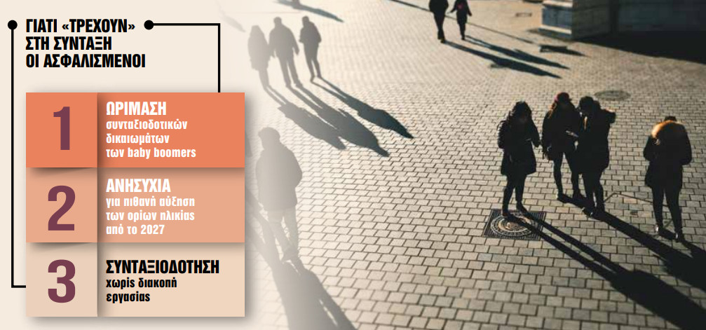 1. Ωρίμαση συνταξιοδοτικών δικαιωμάτων των baby boomers. Η συγκεκριμένη γενιά, που χαρακτηρίζεται από έκρηξη γεννήσεων, αναπτύχθηκε στην Ελλάδα μεταξύ 1960 και 1965, αρκετά αργότερα σε σχέση με τη Δυτική Ευρώπη και τις ΗΠΑ. Την περίοδο εκείνη καταγράφονταν περίπου 170.000 γεννήσεις ετησίως, όταν σήμερα οι γεννήσεις δεν ξεπερνούν τις 90.000 τον χρόνο.