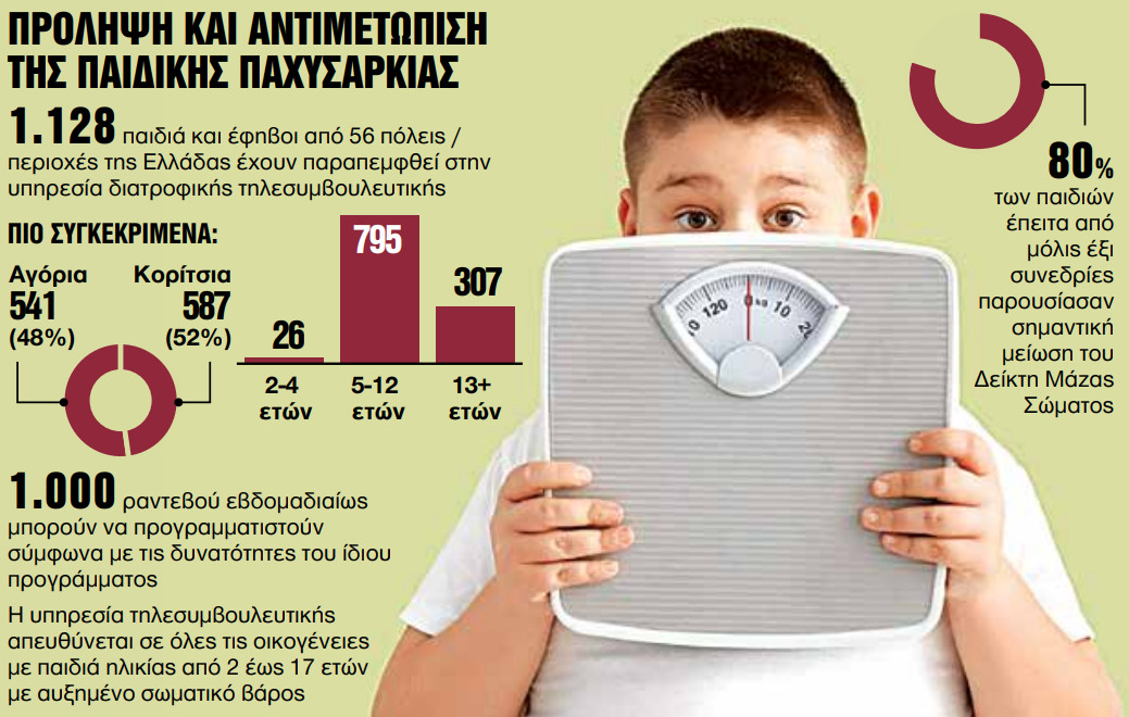 Σύμφωνα με τα στοιχεία που έχουν στη διάθεση τους «ΤΑ ΝΕΑ», συνολικά 1.128 παιδιά και έφηβοι, ηλικίας από 2 έως άνω των 17 ετών με υπερβαρότητα ή παχυσαρκία, έχουν παραπεμφθεί μέχρι σήμερα στην υπηρεσία διατροφικής τηλεσυμβουλευτικής από παιδιάτρους και γιατρούς άλλων ειδικοτήτων. Η συμμετοχή είναι σχεδόν ισόρροπη ανάμεσα σε αγόρια και κορίτσια, ενώ η μεγαλύτερη προσέλευση καταγράφεται από την Αττική, τη Θεσσαλονίκη, την Κρήτη και τις Κυκλάδες, γεγονός που επιβεβαιώνει ότι το πρόβλημα δεν περιορίζεται στα μεγάλα αστικά κέντρα.