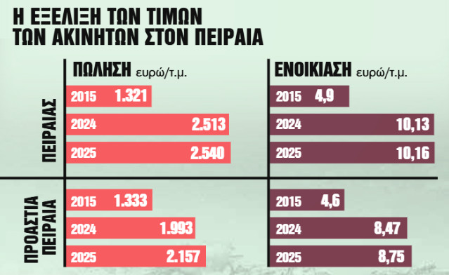 Στην ενοικίαση κατοικίας, οι περιοχές που κατέγραψαν τις μεγαλύτερες ετήσιες αυξήσεις κατά το τελευταίο τρίμηνο του 2025 ήταν μεταξύ άλλων το Πέραμα (19,4%), το Ιλιον και το Χαϊδάρι, με αυξήσεις λίγο άνω του 13%.