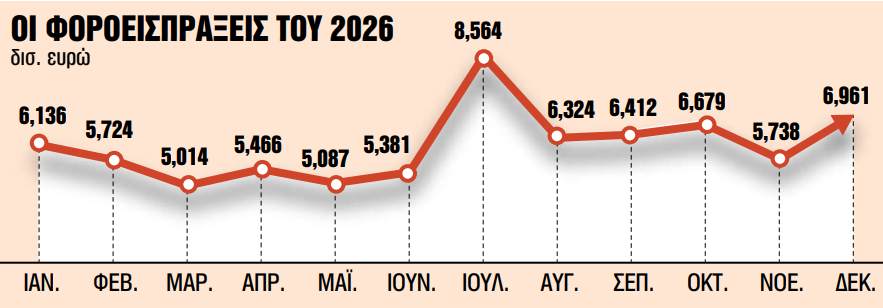 Νοικοκυριά και επιχειρήσεις καλούνται να πληρώσουν φέτος φόρους ύψους 73,477 δισ. ευρώ. Δηλαδή, κάθε μήνα θα πρέπει να καταβάλλουν στην Εφορία πάνω από 6,1 δισ. ευρώ κατά μέσον όρο. Οι φοροεισπράξεις προβλέπεται να είναι αυξημένες σε σχέση με το 2025 λόγω της προβλεπόμενης μεγέθυνσης της οικονομίας και αύξησης των εισοδημάτων.