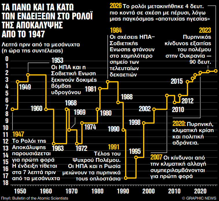 Με τρόπο εντυπωσιακό, το Ρολόι της Αποκάλυψης που δείχνει πόσο κοντά βρισκόμαστε στον ολικό αφανισμό έκανε φέτος ένα ακόμη μικρό άλμα προς τα μεσάνυχτα. Σε μια χρονιά που οι κρίσεις πολλαπλασιάζονται ταχύτερα απ’ ό,τι προλαβαίνουν να καταγραφούν, οι δείκτες του ρολογιού μετακινήθηκαν το 2026 πιο κοντά στην καταστροφή από ποτέ, και μάλιστα με γρήγορο ρυθμό. Η επιτροπή πυρηνικών επιστημόνων «Bulletin of the Atomic Scientists» όρισε χθες την «Ωρα της Αποκάλυψης» για τη φετινή χρονιά στα 85 δευτερόλεπτα πριν από τα μεσάνυχτα, δηλαδή τέσσερα δευτερόλεπτα λιγότερα σε σχέση με πέρυσι, εντείνοντας το κλίμα ανησυχίας και αβεβαιότητας καθώς κάθε νέο δευτερόλεπτο που χάνεται μοιάζει να σβήνει ένα κομμάτι από το μέλλον. Πυρηνικές δυνάμεις που σκληραίνουν τη στάση τους, πολεμικά μέτωπα που ανοίγουν αντί να κλείνουν και η τεχνητή νοημοσύνη που εξελίσσεται πιο γρήγορα απ’ όσο προλαβαίνουν να γραφτούν οι νόμοι που θα τη θωρακίσουν συνθέτουν το υπόβαθρο για τη νέα «ένδειξη».