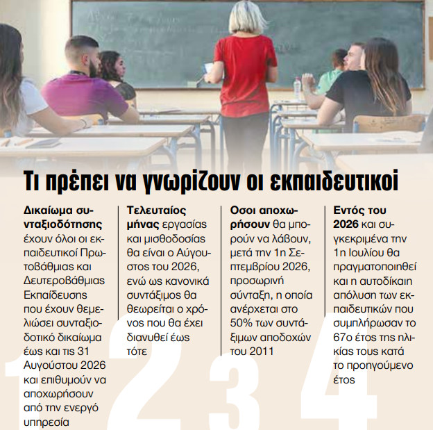 Δικαίωμα συνταξιοδότησης έχουν όλοι οι εκπαιδευτικοί Πρωτοβάθμιας και Δευτεροβάθμιας Εκπαίδευσης που έχουν θεμελιώσει συνταξιοδοτικό δικαίωμα έως και τις 31 Αυγούστου 2026 και επιθυμούν να αποχωρήσουν από την ενεργό υπηρεσία. Τελευταίος μήνας εργασίας και μισθοδοσίας θα είναι ο Αύγουστος του 2026, ενώ ως κανονικά συντάξιμος θα θεωρείται ο χρόνος που θα έχει διανυθεί έως τότε. Οσοι αποχωρήσουν θα μπορούν να λάβουν, μετά την 1η Σεπτεμβρίου 2026, προσωρινή σύνταξη, η οποία ανέρχεται στο 50% των συντάξιμων αποδοχών του 2011. Για την έκδοση της οριστικής συνταξιοδοτικής απόφασης απαιτείται αναμονή περίπου 4 έως 8 μηνών, με βάση το μοντέλο της ψηφιακής σύνταξης (fast track) και της αυτοματοποιημένης επεξεργασίας των στοιχείων.
