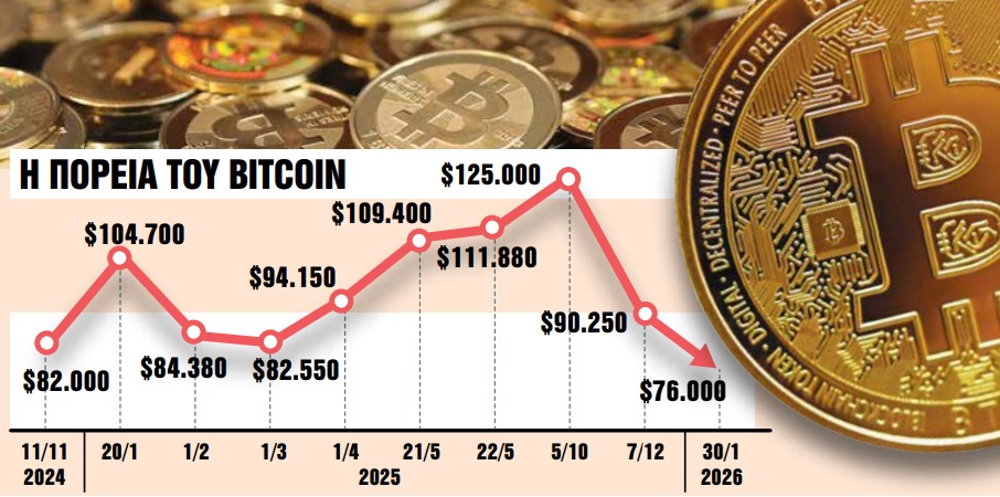 Υποχώρηση κατά 40% από τα ιστορικά υψηλά που είχε καταγράψει το 2025 σημειώνει πλέον το Bitcoin. Το μεγαλύτερο κρυπτονόμισμα στον κόσμο υποχώρησε κάτω από τα 76.000 δολάρια λόγω νέας εξόδου «παικτών» που ανησυχούν για γεωπολιτικούς κινδύνους και για συνεχιζόμενη υποχώρηση του αμερικανικού δολαρίου εν μέσω γενικότερης μείωσης ρευστότητας στην αγορά. Η βουτιά στις τιμές του Bitcoin καταγράφηκε καθώς η αγορά έχει στραφεί σε μεγάλο βαθμό σε πολύτιμα μέταλλα όπως ο χρυσός και το ασήμι, ως μέσο αντιστάθμισης κινδύνου για γεωπολιτικές εξελίξεις και εν μέσω φόβων για πιθανή νέα επιβολή δασμών από τις ΗΠΑ κυρίως προς την Ευρώπη αλλά και άλλες χώρες.