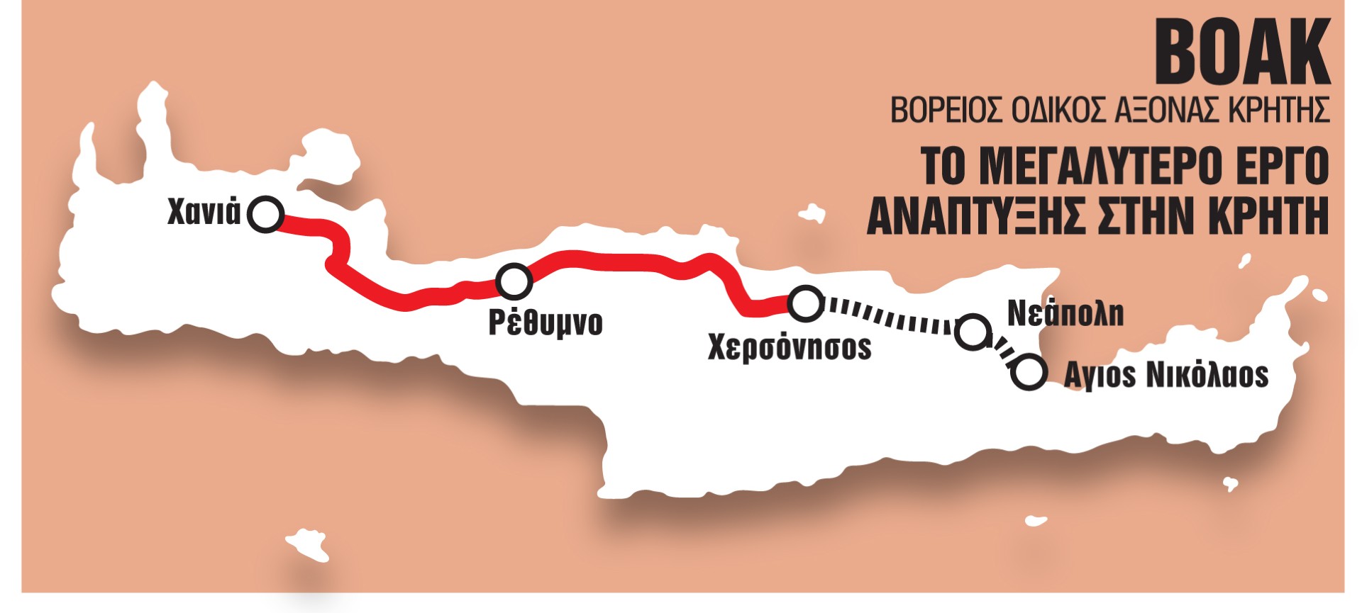 Ο Βόρειος Οδικός Αξονας Κρήτης συνολικού μήκους περίπου 300 χλμ. – περιλαμβάνοντας επίσης τα υπό κατασκευή τμήματα «Χερσόνησος – Νεάπολη» και «Νεάπολη – Αγιος Νικόλαος» – είναι ένα από τα μεγαλύτερα αναπτυξιακά έργα που υλοποιούνται στην Ελλάδα, μείζονος σημασίας για την οδική ασφάλεια, τη διασύνδεση των πόλεων και την περιφερειακή ανάπτυξη.