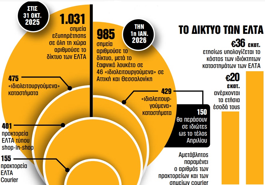 Από την 1η Ιανουαρίου 2026, μετά το ξαφνικό λουκέτο σε 46 «ιδιολειτουργούμενα» καταστήματα σε περιοχές υψηλής αστικής πυκνότητας, όπως η Αττική και η Θεσσαλονίκη, το δίκτυο διαμορφώθηκε σε 985 σημεία. Τα «ιδιολειτουργούμενα» καταστήματα ανέρχονται πλέον σε 429, εκ των οποίων 150 θα περάσουν σε ιδιώτες ως το τέλος Απριλίου, ενώ ο αριθμός των πρακτορείων και των σημείων courier παραμένει αμετάβλητος.